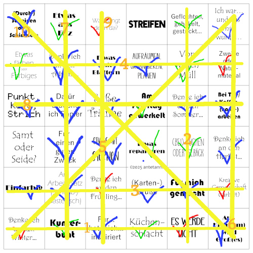 Inzwischen verzeichne ich den 10. Bingo, bei den letzten Feldern habe ich irgendwann den Überblick über all die Möglichkeiten, kreuz und quer Linien zu ziehen, verloren. Es haben sich eine Menge unverbloggte Aktionen angesammelt. Falls es im nächsten Jahr wieder ein Jahresbingo gibt, was ich sehr hoffe, muss ich mich besser organisieren.