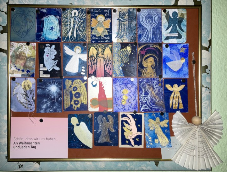 Das sind meine Engel. Das Nachtblau ist je nach Ansatz etwas unterschiedlich ausgefallen, ich hatte am Anfang viel zu wenig Farbe angemischt. Die gedruckten Papiere mussten dann noch auf Pappkarton geklebt und dann an die 24 anderen Postkünstlerinnen aus meiner Gruppe verschickt werden. Ich hatte den 6. Dezember zugeteilt bekommen, das ist dann der Tag, an dem meine Postkunst bei den anderen Teilnehmerinnen im Briefkasten sein soll. Dadurch hatte ich am Monatsanfang etwas Stress und konnte mich dann bequem zurücklehnen und die täglich eintreffenden ATC’s genießen.