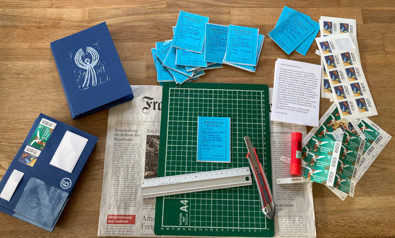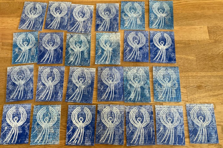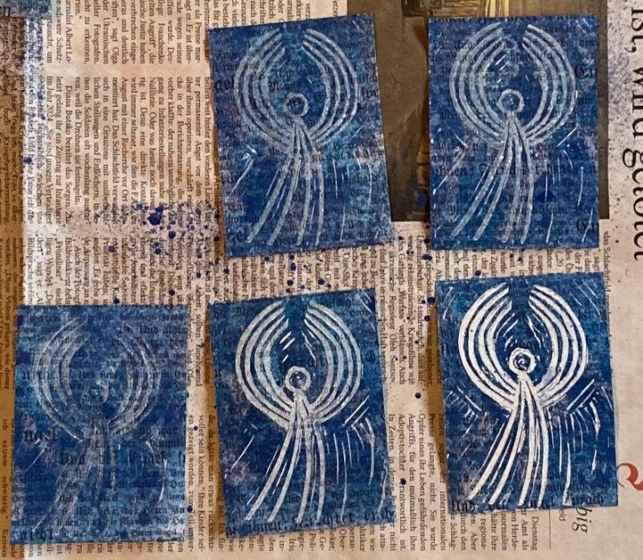 Seit Jahren veranstalten Tabea und Michaela vom Postkunstwerk über das Jahr verteilt verschiedene Postkunst-Tauschaktionen. Die beliebtestet Aktion ist dabei die Adventspost, in der man in Gruppen von je 24 (dieses Jahr 25) Leuten selbst gemachte Postkarten oder andere Kunstwerke miteinander tauscht. Dabei sind das Format, die (Druck-) Technik, das Thema und das Farbkonzept vorgegeben. Dieses Jahr waren das eine ATC (Artists Trading Card, das sind kleine Kunstwerke im Format 64x89mm, die man in einer kleinen Serie auflegt und nur tauscht, nicht verkauft), in einer oder mehreren beliebigen Drucktechnik, Motiv: Engel und die Farbe Nachtblau, wobei die Definition „Nachtblau“ im Belieben der Künstlerin lag und auch nicht flächendeckend eingesetzt werden musste.