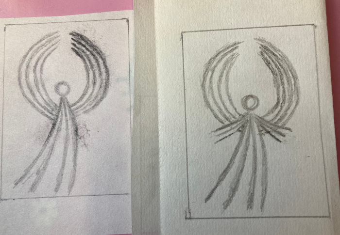 Die allererste Postkunst, die Tabea und Michaela veranstaltet haben, hatte genau dieses Format und seither warte ich darauf, dass es nochmal wiederholt wird. Kaum hatte ich davon erfahren, hatte ich sofort ein Bild im Kopf, wie ich meine Karte gestalten wollte. Es war total irre, so etwas habe ich noch nie erlebt. Nachts um vier machte ich meine erste Skizze von dem Engel und notierte mir, wie ich den Hintergrund gestalten wollte.