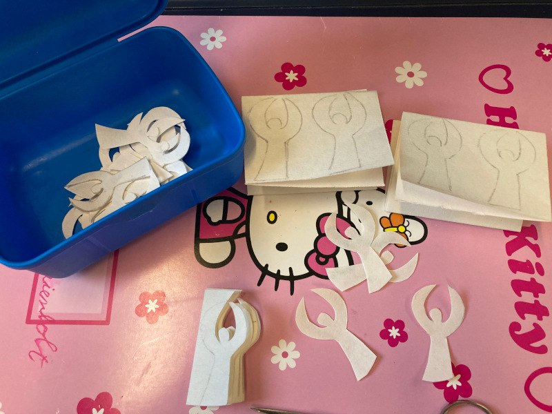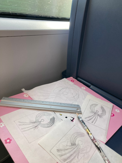 Anfang November musste ich für einen Termin nach München. Im ICE brachte ich den Engel in das richtige Format, entschied mich gegen Arme und schnitt massenhaft kleine Engel als Schablonen aus.