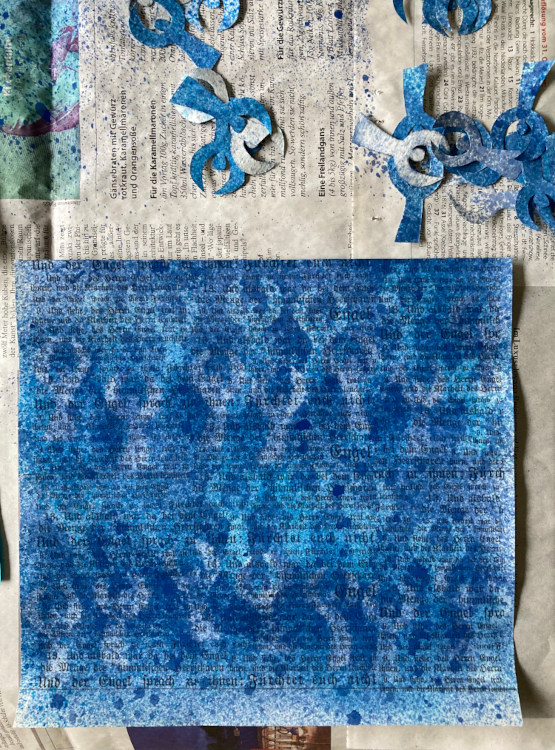Am Ende verschwand der mühsam hergestellte Hintergrund mit den Engels-Silhouetten unter dem Linoldruck, aber der Bibeltext blieb mehr oder weniger erkennbar.