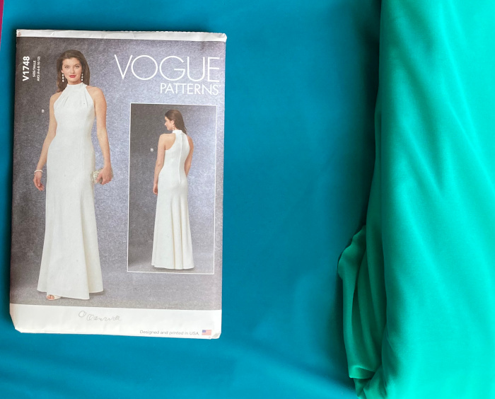 Ich habe Vogue 1748 in Größe 12 genäht und den Saum um 3,5 cm verlängert. Gedacht ist der Schnitt für einen Crepe oder ähnliches. Dank meines stretchigen Materials und der ebenfalls sehr elastischen Vliseline H609 konnte ich auf den Reißverschluss verzichten und bekomme das Kleid trotzdem über meinen Kopf.