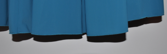 Der Oberstoff machte erwartungsgemäß keine Probleme bei der Verarbeitung. Ich habe dort insgesamt 7cm herausgenommen, habe also fast eine Größe kleiner genäht. Im Gegensatz zum roten Kleid habe ich dieses gesäumt, mit einem ganz feinen Rollsaum. Ich hatte echtes Glück, als ich im Nähmaschinen-Laden noch Stecknadeln für ein Last-Minute-Geschenk kaufte, entdeckte ich doch tatsächlich Overlock-Garn in exakt der passenden Farbe! Mit dem Saum bin ich so zufrieden, dass ich überlege, das rote Kleid doch noch zu säumen, vielleicht habe ich bei Gütermann-Palette etwas mehr Glück als bei Madeira, den passenden Farbton zu finden