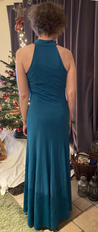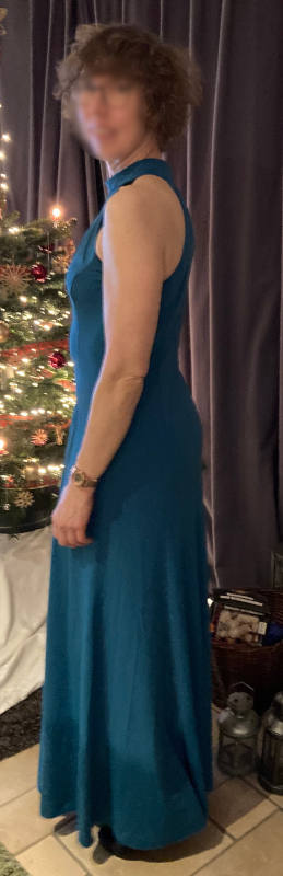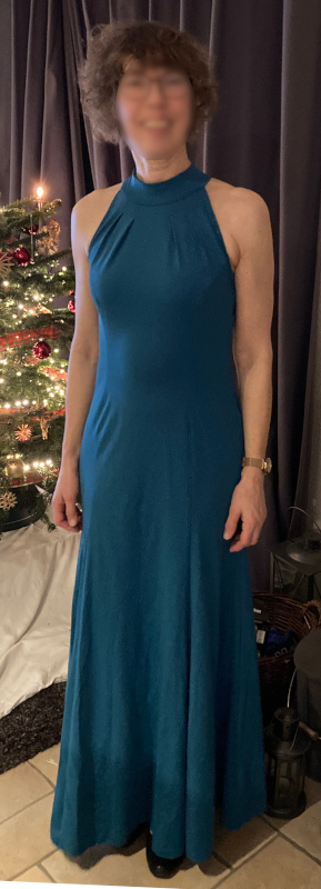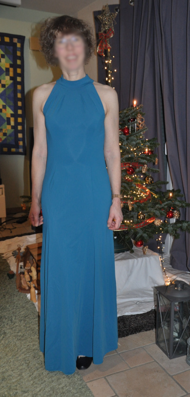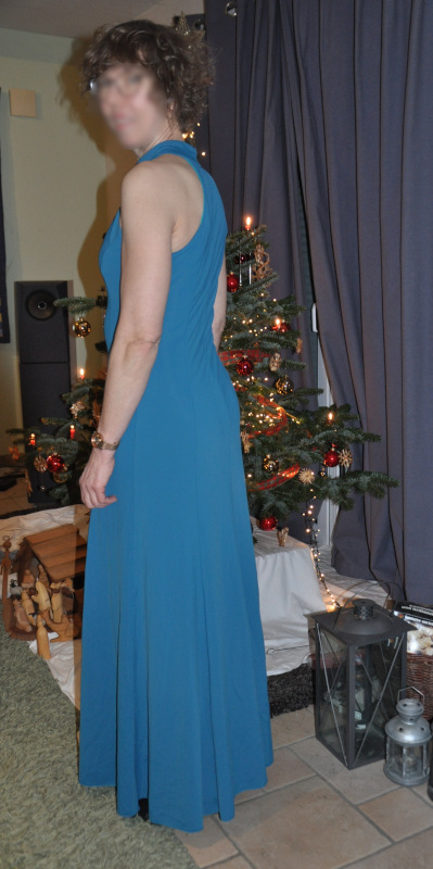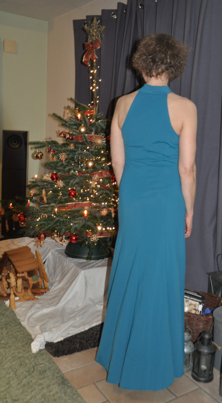 Das Kleid war gedacht für eine Tanzparty am 27. Dezember. Am 27.12. pünktlich um 18:15 Uhr war das Kleid fertig und ich war aufgebrezelt und bereit, den Tanzboden zu stürmen. Und dann gingen wir aus dem Haus und die Straße war stellenweise spiegelglatt. So glatt, dass wir es nicht riskieren wollten, weg zu fahren. Und so wartet mein schönes Kleid ungetragen auf die nächste Gelegenheit, denn zum Kochen mit Freunden an Sylvester wollte ich dann doch nicht tragen.