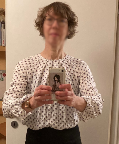Vor noch viel mehr Jahren habe ich einmal ein Shirt aus einem weißen Romanit genäht, und mir kam der Schnitt auch für eine Bluse geeignet vor. Das war die Zeit, als die ersten Blusenshirts aus Webware auftauchten. Das fertige Shirt sah aber gar nicht leger und salopp sondern todlangweilig aus, und ich weiß bis heute nicht, warum. Liegt es an dem kontrastarmen Stoff? Dem Ausschnitt mit den Falten? Wären Kräusel besser und/oder ein Kragen? Vielleicht ist der Ausschnitt auch einfach zu eng oder braucht einen kontrastfarbigen Abschluss? Oder fehlen den Ärmeln mit dem Gummizug irgendwelche markanten Details?