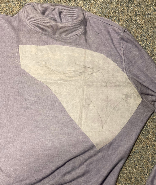 Die Nadeln markieren die Löcher, auf dem Stickvlies auf der Rückseite habe ich die Ranke skizziert und recht ist das eher unbefriedigende Ergebnis. Die Ranke sah eher unmotiviert aus. Also habe ich mich mit dem Grafitstift in der Hand vor den Spiegel gestellt, Ranken ergänzt und dann beim Sticken noch großzügig kleine Blüten verteilt.