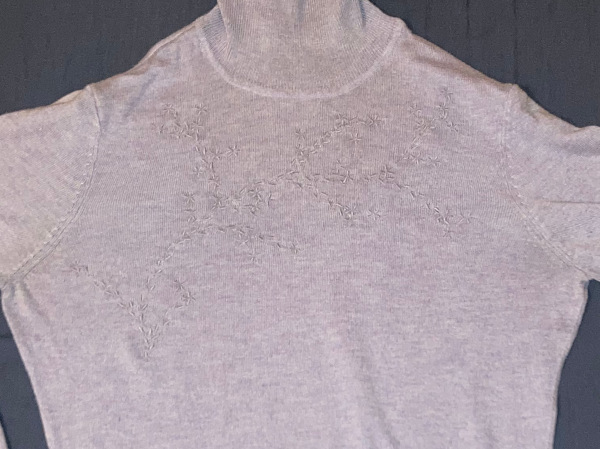 Am aufwändigsten war der Wollpulli, da waren so viele Löcher drin, dass ich nicht auf jedes ein eigenes Blümchen sticken wollte. Der Versuch, die Löcher unsichtbar von Hand zu stopfen, hatte leider nicht funktioniert, vielleicht bin ich dafür nicht geduldig genug, oder Garn und Nadel waren zu dick. Ich dachte, es würde gut aussehen, die Löcher mit einer Blätterranke zu verbinden und dann auf die Löcher kleine Blümchen zu sticken.