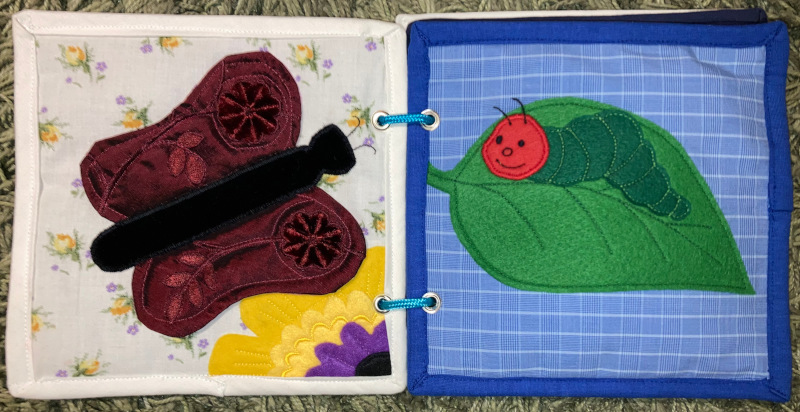 Bei Stoff-Bilderbüchern interessiert mich mehr die Haptik. Gerade für sehr kleine Kinder ist es schön, unterschiedliche Strukturen zum Tasten anzubieten. Der Schmetterling, zu dem die kleine Raupe geworden ist, hat zum Beispiel einen Körper aus Samt und Flügel aus einem bestickten und beflockten Satin.
