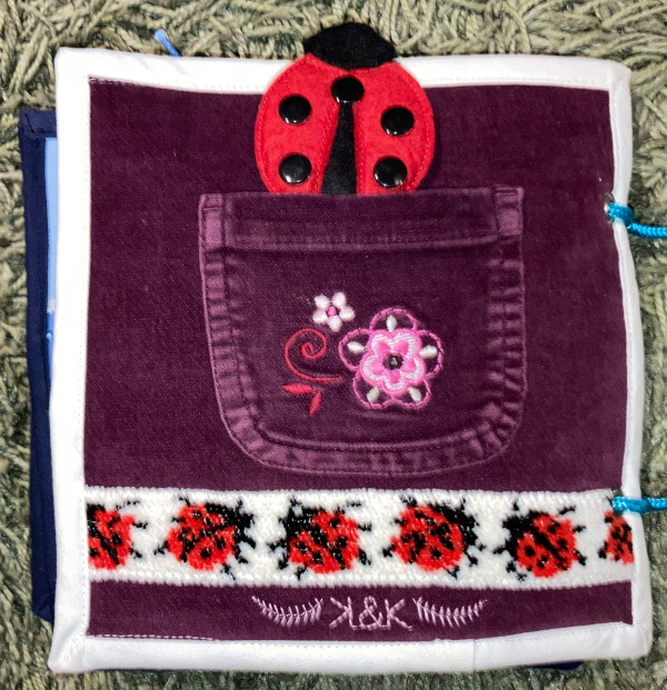 Die letzte Seite ist aus einer Lieblingshose meiner Kinder und einem kleinen Rest von der Borte, die meine Mutter auf meinen Kinderbademantel genäht hatte. Der Bademantel war ein absolutes Lieblingsstück von mir und den kleinen Bortenrest habe ich jahrelang gehütet, bis er endlich eine gute Verwendung gefunden hat.