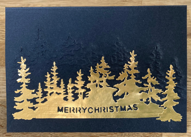 Das goldene Papier ist einfaches Geschenkpapier, das ich mal geschenkt bekommen habe, ziemlich dünn und nicht besonders viel. Ich hatte vielleicht ein A5 großes Stück und habe es restlos verbraucht, um noch genug Tannenbäume für drei weitere Karten, die noch geklebt werden müssen, zusammen zu bekommen.