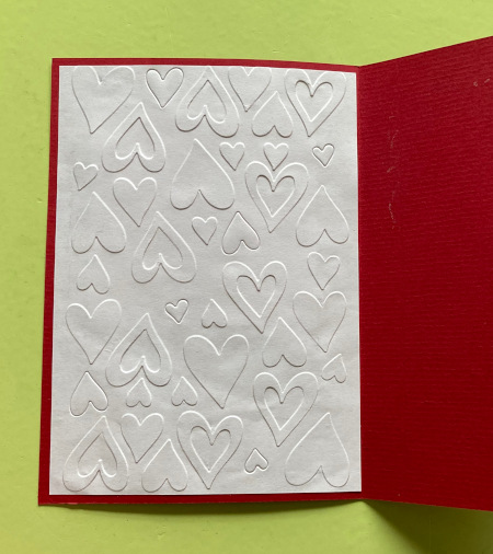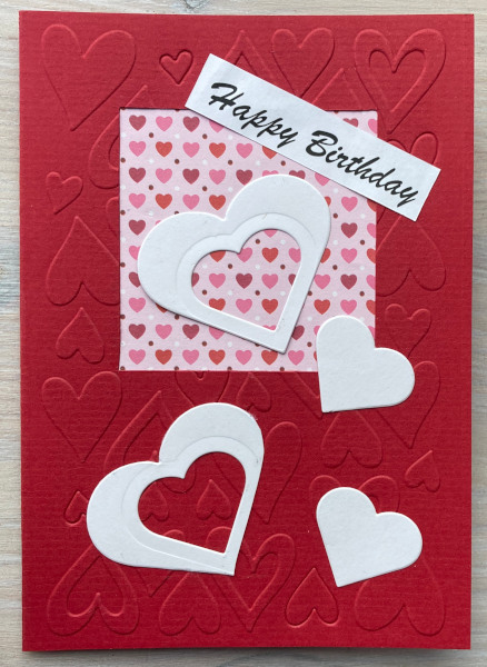 Ich hatte anfangs nur sehr wenig Herzchenpapier gefunden und habe deshalb ein Fenster ausgschnitten und hinterklebt. Damit die Karte dann auch von innen schön war, habe ich alles mit einem geprägten Blatt abgeklebt. Als ich mit der Karte fertig war, war ich erstmal Herz-Stanzen shoppen. Und noch ein paar andere Motive. Da werden also noch ganz herzige Zeiten kommen.