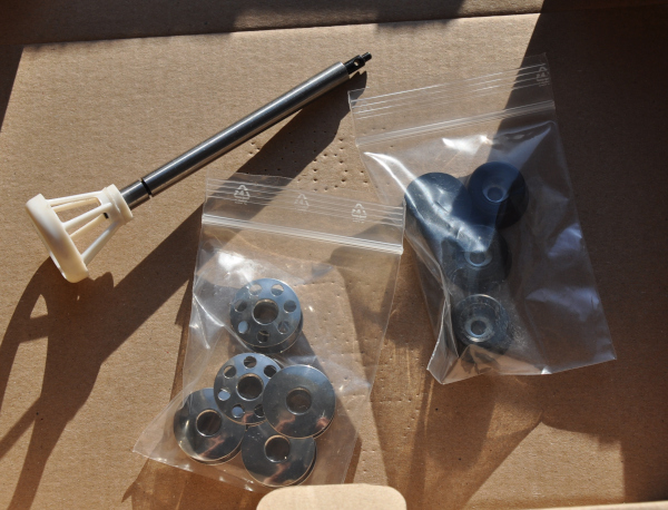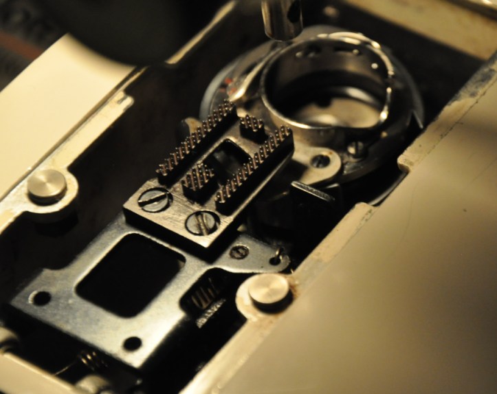 Der Obertransportfuß, ein echter Gamechanger. Der merkwürdige Bubsel oben im Bild ist ein Spulenheber, um die Unterfadenspule zu wechseln. Ist das nicht genial? Übrigens passt der Halter für die Nähfüße von der kleinen Pfaff an die Lotus, so dass ich alle meine Nähfüße dort auch verwenden kann, nur die Markierungen für die Nadelposition stimmen nicht überein. Ein Versuch mit Eurem Equipment lohnt sich unbedingt.