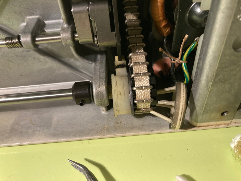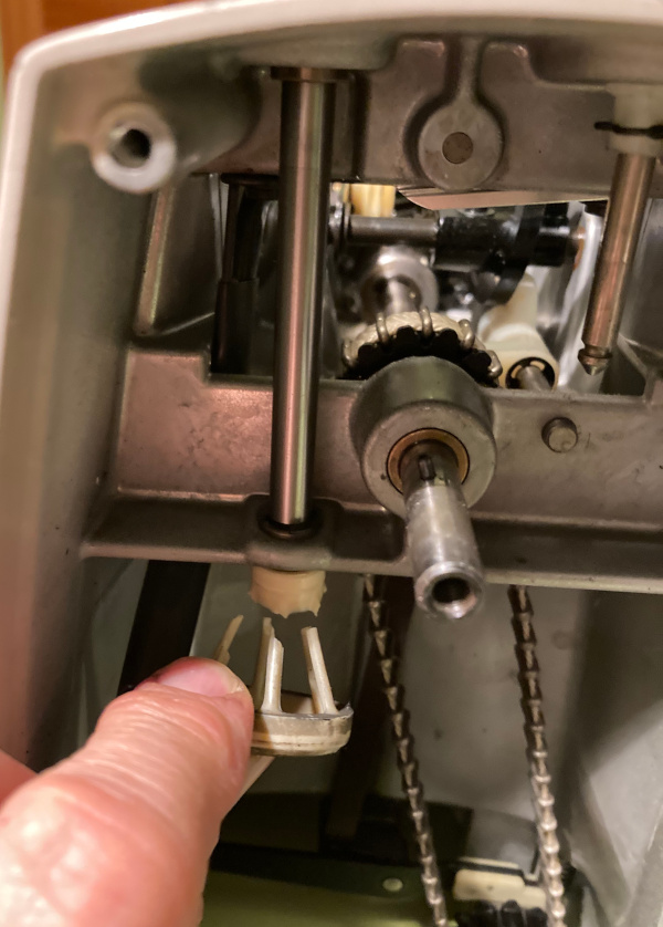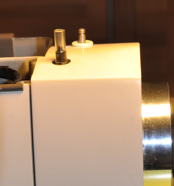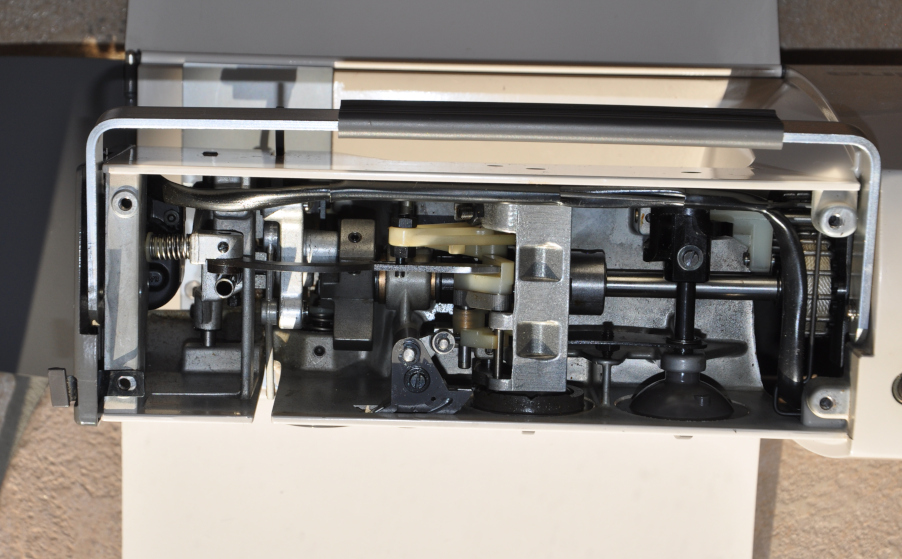 Auch die Schalter, an denen man die Stichlänge, Stichbreite und, bei der SP, die Zick-Zack-Programme ausswählt, freuen sich über etwas Öl. Nicht geölt wird der Antriebsriemen, der bestimmt auch einen speziellen Namen hat, und auf gar keinen Fall geölt wird das Gummirad, das sich hinter der rechten Abdeckung befindet, über die ich später berichte. Am Greifer für den Unterfaden ölt man die Stelle, die in der Anleitung beschrieben wird.