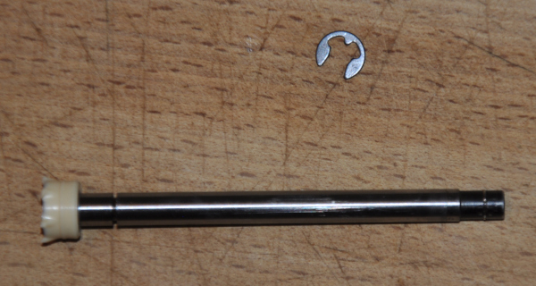 Man zieht die alte Stange nach unten ab, schiebt die neue auf, ölt ein bisschen, und presst die Feder wieder in den Schlitz. Je nach Spuler muss dann oben noch ein kleiner Plastiknubsel mit einer Feder und einem Splint befestigt werden, damit die Spule auch wirklich hält. Ich habe diesen Nubsel leider nicht mehr bekommen, aber bei einem guten Heimwerker ist immer etwas brauchbares in der „Gänsefleisch-Kiste“ (Gän Se fleisch mal brochen!) Ich fand einen dünnen Silikonschlauch, von dem ich einen kleinen Abschnitt mit sanfter Gewalt auf die Stange pressen konnte (Erwärmen des Schlauchs mit einem Fön ist da hilfreich). Die Alternative wäre zum Beispiel ein Dübel und etwas Klebeband.