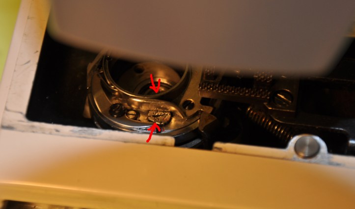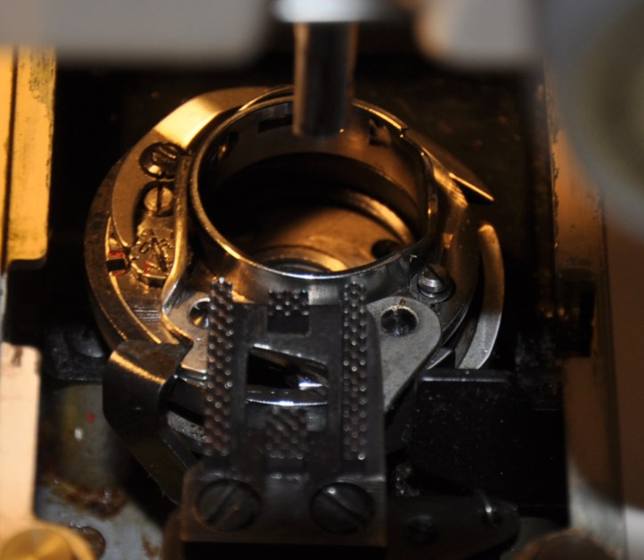 In der Mitte des Greifers ist eine Schraube. Wenn der Greifer schwer zu gehen scheint, dürft Ihr an den Rand etwas Öl geben. Ihr wollt diese Schraube nicht lösen! Nein. Vertraut mir, das wollt Ihr nicht! Ich habe das gemacht, das Handrad gedreht, und auf einmal hatte ich den Greifer in der Hand. Ich habe auch nach stundenlanger Suche kein passendes Video oder eine Anleitung gefunden, wie er wieder richtig positioniert wird und eine gefühlte Ewigkeit herumprobiert, bis der Greifer den Oberfaden wieder richtig mitgenommen hat. Also nochmal: Hände weg von dieser Schraube! Ohnehin kann man an Fäden, die dort festgeklemmt sein könnten, entweder von oben oder von unten mit einer langen Pinzette herankommen. Wenn der Greifer sich nicht dreht, ist vermutlich das Plastikritzel, das ihn antreibt, kaputt. Ich würde dann an dieser Stelle die Maschine einem Techniker übergeben.