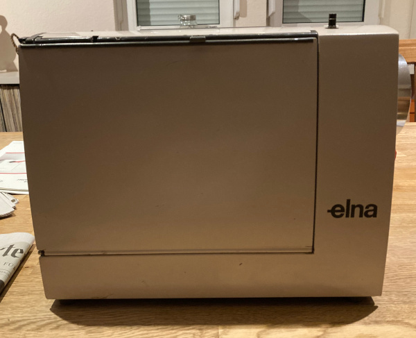 Die Elna Lotus SP (wie spezial) Modell 35 wurde Ende der 1960er – Anfang der 1970er in der Schweiz gebaut. Das Design ist preisgekrönt, vollkommen zu Recht. Vorne, hinten und an der linken Seite lassen sich die Wände der Verpackung herunterklappen und werden zum Anschiebetisch. Sie öffnet sich quasi wie eine Lotusblüte, daher der Name. Von der Größe ist sie etwas tiefer als ein Aktenordner, der auf dem Rücken liegt. Gewicht bescheidene 6,3kG. Für die Größe scheint das schwer, das liegt daran, dass innen fast kein Plastik verbaut ist.