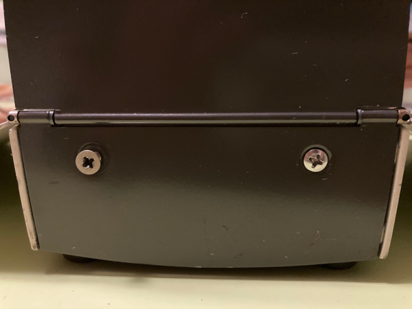 Bei der Lotus öffnet man die Maschine von oben. In den Ecken des Zubehör-Faches sind vier Phillips-Schrauben, die sich einfach herausdrehen lassen. Aufpassen, die Verschluss-Feder für die linke Seitenklappe ist mit der linken vorderen Schraube befestigt. Wenn die Maschine offen ist, kann man erstmal allen Staub, den man findet, mit Druckluft herausblasen.