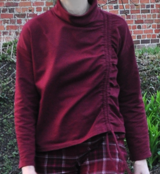 Die Anleitung ist sehr gut und die größte Schwierigkeit besteht darin, den Rollkragen einzunähen. Für die Raffung gibt es eine Teilungsnaht mit zwei Zentimetern Nahtzugabe, die auseinander gebügelt und an den Kanten festgesteppt wird. Bei einem festeren Stoff, so wie dem meinen, würde ich diese Nahtzugabe um einen halben Zentimeter erweitern, weil dann das Bindeband (für das es sogar ein eigenes Schnittteil gibt), besser gleitet und die Raffung etwas weniger steif wird. Man kann das Shirt ohne Probleme auf einer normalen Nähmaschine nähen, wenn man keine Ovi hat, sollte aber dann einen gut dehnbaren Zickzack-Stich oder elastisches Nähgarn auswählen, um den Rollkragen einzusetzen. Die Ovi ist hier nur für die innere Schönheit von Nöten.