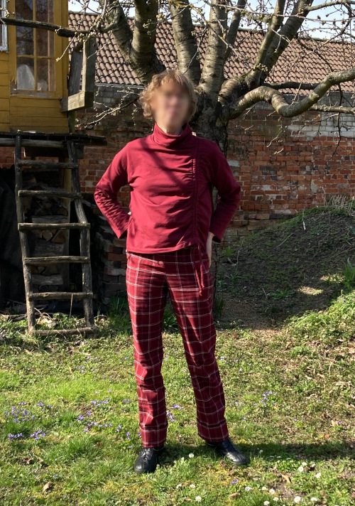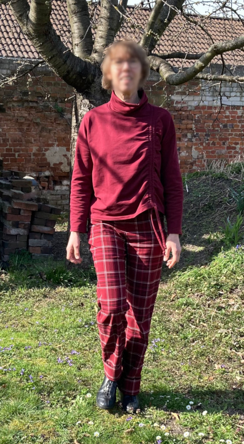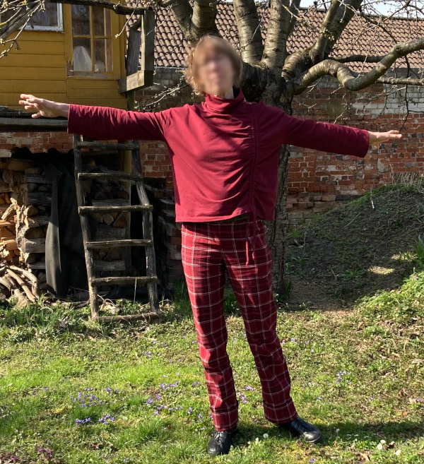 Für mich sind die Ärmel etwas zu kurz, was zum einen an meinen Armen, zum anderen aber sicher auch an der Größenauswahl liegen dürfte. An dieser Stelle sollte man unbedingt etwas mehr Saumzugabe einplanen, denn wie es so schön heißt: Abschneiden geht immer, dranschneiden eher nicht. Durch die Weite und die Kürze und das Material ist das Shirt leider etwas zugig und ich habe bereits einen Tag erbärmlich darin gefroren. Aus einem leichten Fleece-Stoff wäre es aber sicher gut für die kälteren Tage geeignet.