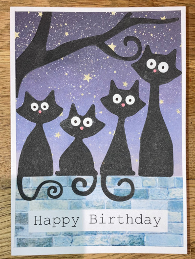 Katzen und Ast sind Stanzen, den Sternenhimmel habe ich als kleinen Motivblock entdeckt und die Mauer ist von Jennifers free Printables, eine Seite, die Tapeten und vieles anderes zum Ausdrucken für Puppenhäuser zur Verfügung stellt. In die Katzen bin ich ganz verliebt, auch wenn die Stanzen ziemlich mies sind. Man muss reichlich nachschneiden, das macht das Basteln ziemlich auffwändig. Aber es wird sicherlich noch einige Katzen mehr geben.